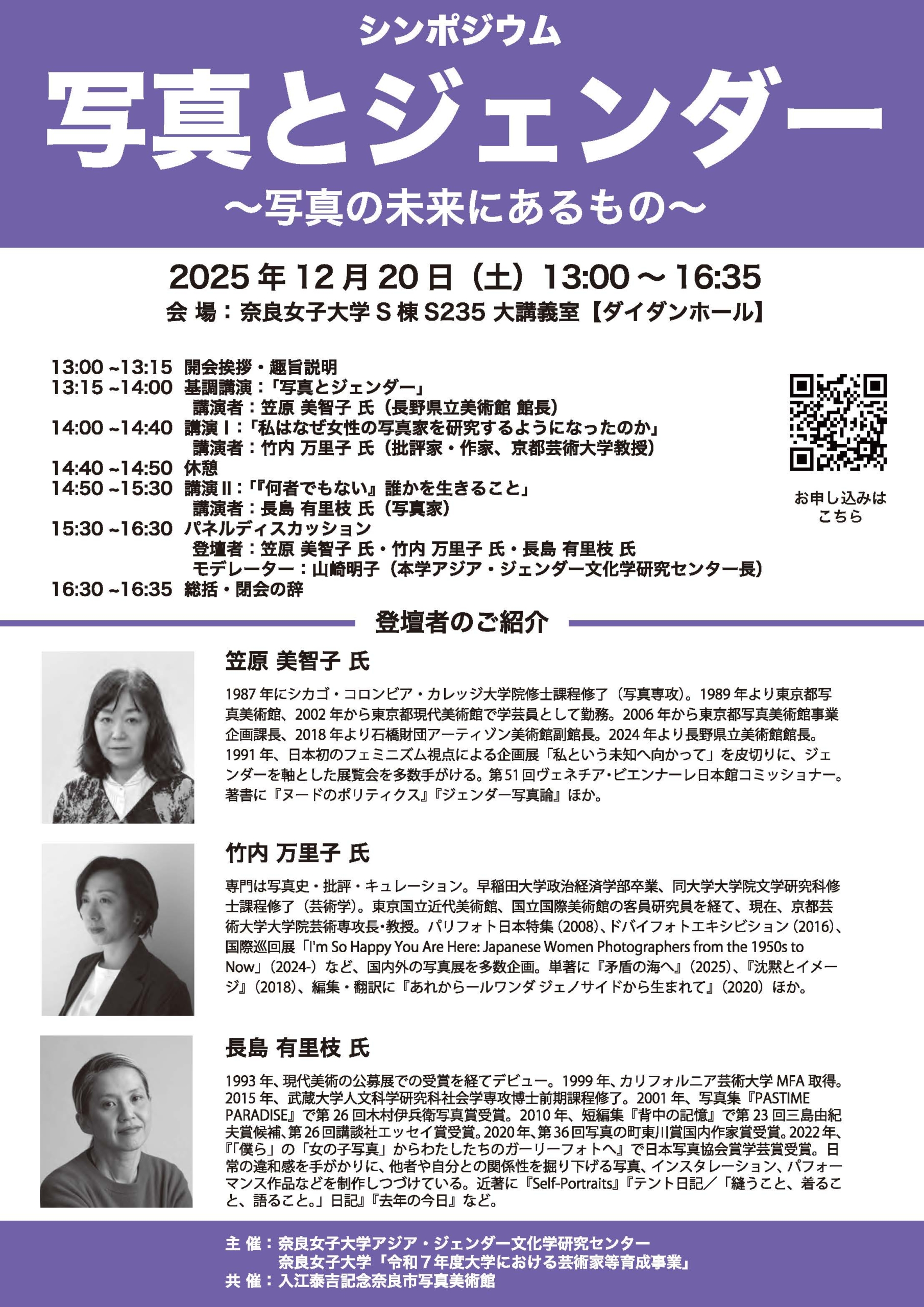 本シンポジウムでは、「写真とジェンダー」の関係を考察し、女性による写真表現の過去・現在・未来を展望いたします。基調講演には笠原美智子氏、パネリストには竹内万里子氏・長島有里枝氏を迎え、写真界におけるジェンダー的課題とその可能性について多角的に議論します。現代社会における写真の見方を問い直す機会として、皆様のご参加を心よりお待ちしております。